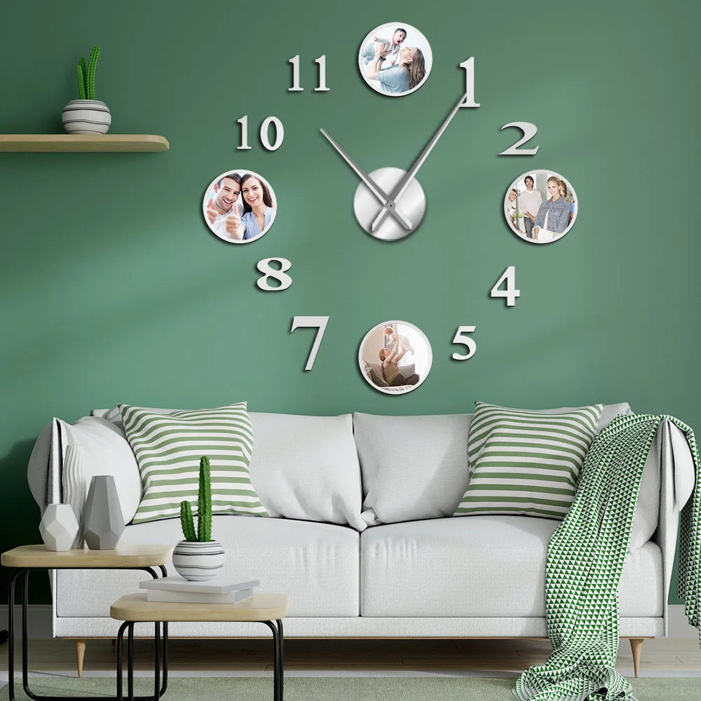 A large customizable wall clock with a decorative family photo frame, adding a personal and elegant touch to your living room.